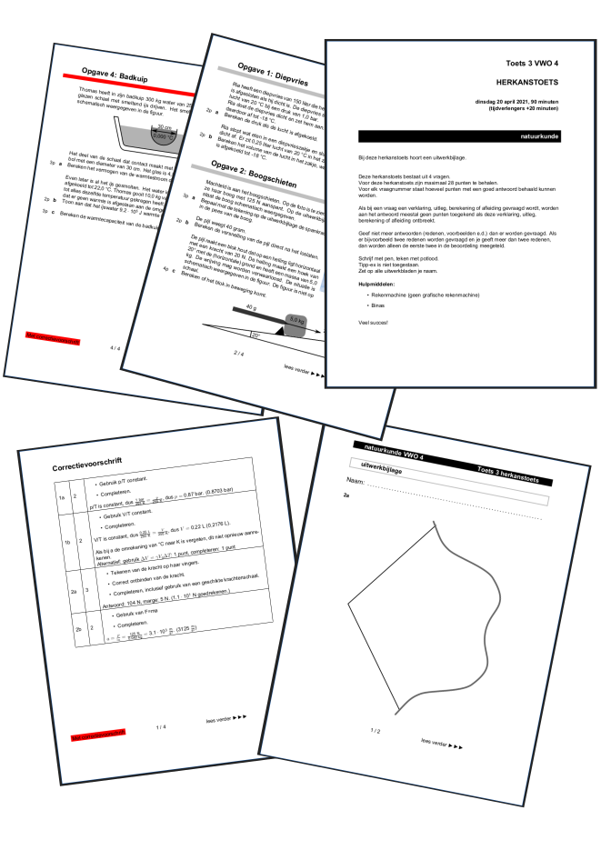 In order to let students get comfortable with the layout of the Dutch national central exams, it is useful to have earlier tests that use the same format, at least in high school. That's what this class file is meant for. When designing the test, the questions and answers must be entered. Two pdf files are generated from that: a test for the students, and a version with the answers, to be used for grading. To save paper, the second version does not include the pages where students should work out their answers.